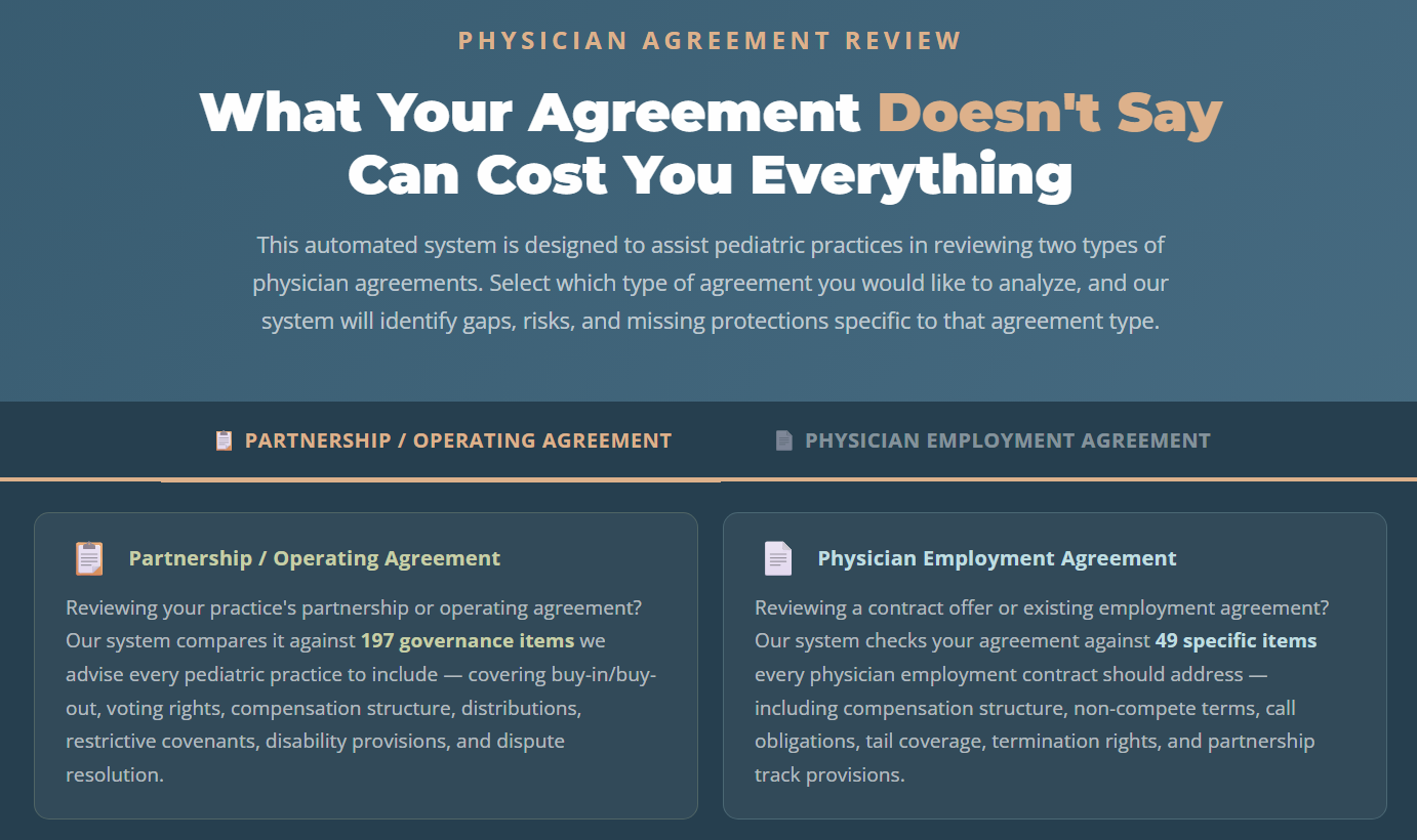 This isn't a generic AI tool that skims for keywords. It's 15 years of PMI consulting experience with pediatric practices encoded into two comprehensive checklists — 197 specific items for partnership and operating agreements, and 49 items for physician employment contracts.